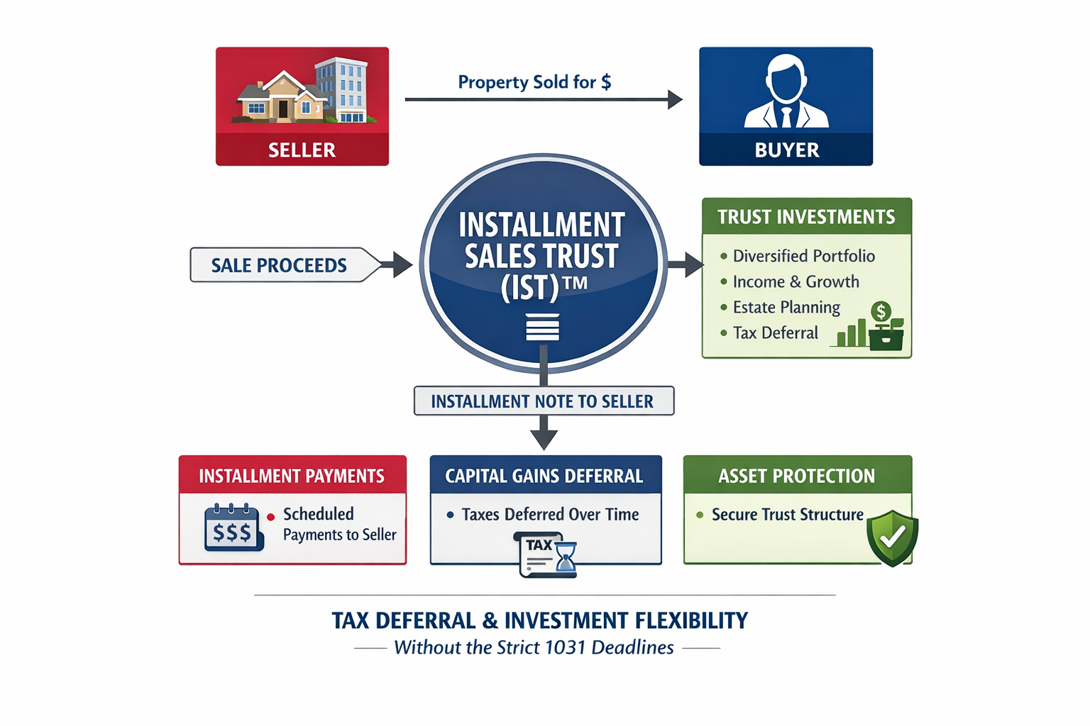 This content is provided for informational purposes only and does not constitute legal or tax advice. Installment Sales Trusts involve complex legal and tax considerations and are not suitable for all transactions. Tax treatment depends on individual circumstances, proper structuring, and ongoing compliance. Consultation with qualified legal, tax, and financial advisors is required.